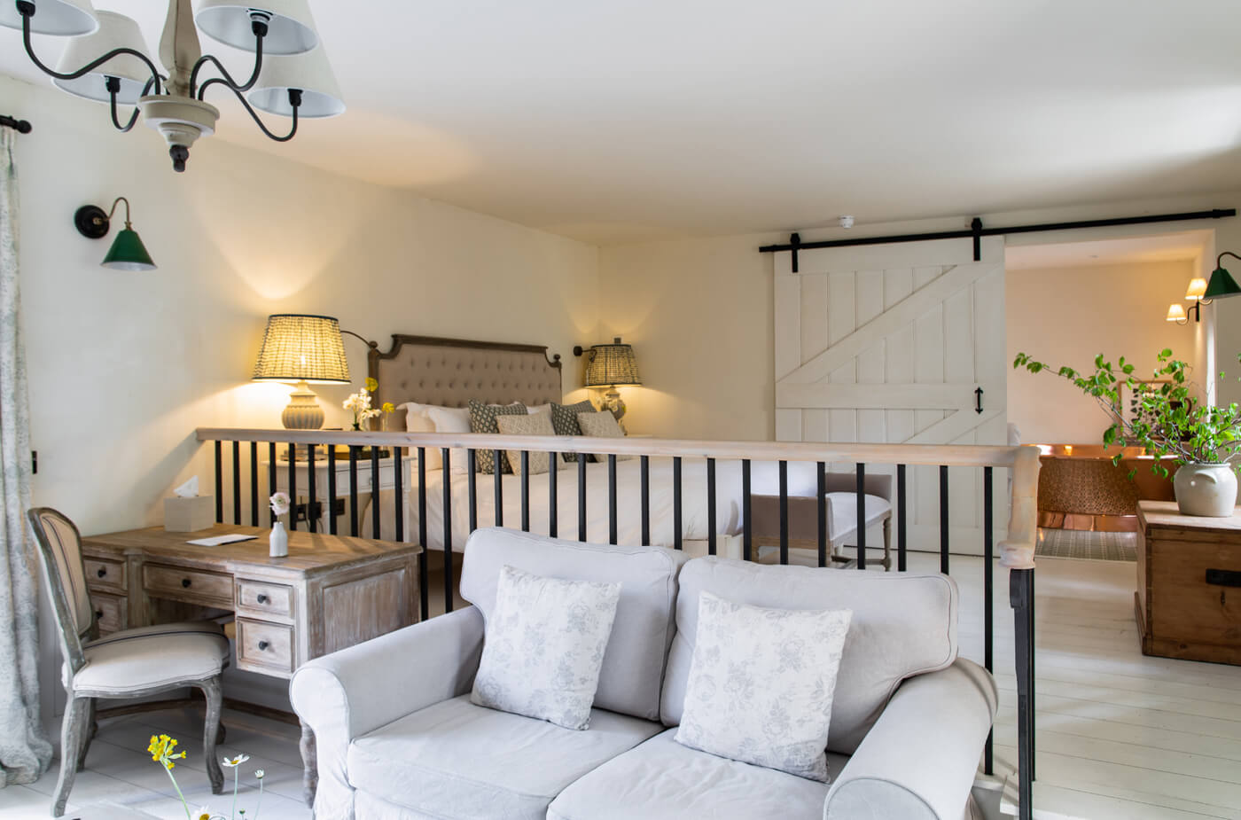 Soft green walls and botanical prints bring a calm atmosphere. This open plan room has a super king bed, copper bath, walk in shower and log burner. Step outside to your terrace with seating and hot tub.